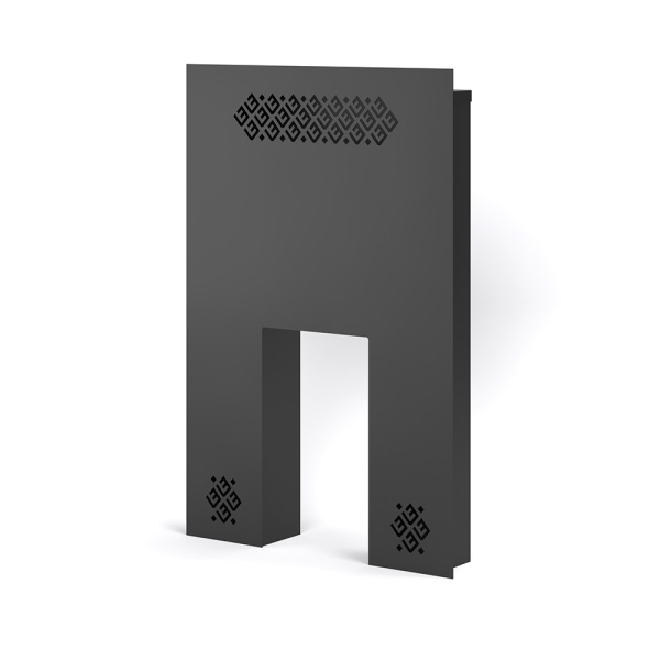 Фронтальный защитный экран сделан в виде П-образной арки, которая обрамляет топочную дверку и топочный тоннель печи. Передняя панель экрана имеет толщину 2 миллиметра, остальные элементы – толщиной 1 миллиметр. Небольшой борт по периметру передней панели позволяет красиво отделать экран и скрыть швы между экраном и стеной.
