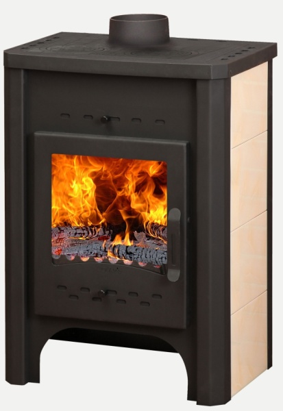 Эта печь имеет чугунный колосник, режим экономичного расхода топлива, систему очистки стекла, керамические вставки на боковых панелях, чугунную плиту на 2 конфорки (Франция) для приготовления пищи.