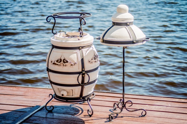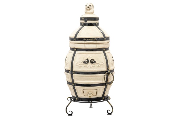 Тандыр "Аполлон" выполнен в виде овального бочонка среднего объёма. Тандыр имеет крышки двух уровней (колпачок и крышку). Удобно выполненный колпачок, позволяет не терять тепло при открывании тандыра. А крышка с удобными ручками позволяет легко открывать тандыр и закладывать в него продукты для приготовления. Кованная подставка - ножки обеспечивает удобное использование тандыра. Красоту тандыру придаёт орнаментальный растительный узор, расположенный в центральной его части. Керамический тандыр в основном выполнен в бежевом цвете, коричневый цвет добавлен в области орнамента. На поверхность орнамента нанесена глазурь, которая защищает его от влаги и грязи. Изготовленный из шамотной глины высокотемпературного обжига он обладает высокой теплопроводностью, экологичностью, прочность и долговечностью более 10 лет.