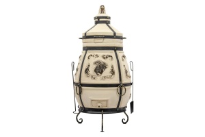 Тандыр "Степной" выполнен в виде горшка большого объёма слегка суженного в верхней части. Тандыр имеет крышки двух уровней (колпачок и крышку). Оригинально выполненный колпачок, в виде головы степного орла - царя степей, позволяет не терять тепло при открывании тандыра. А крышка с удобными ручками даёт возможность легко открывать тандыр и закладывать в него продукты для приготовления. Кованная подставка - ножки обеспечивает удобное использование тандыра. Красоту тандыру придаёт интересный орнаментальный узор, который находится в центральной его части. Узор украшает эффектное изображение головы орла, гордо смотрящего вверх. Керамический тандыр в основном выполнен в бежевом цвете, коричневые оттенки добавлены в области орнамента. На поверхность орнамента нанесена глазурь, которая защищает его от влаги и грязи. Изготовленный из шамотной глины высокотемпературного обжига тандыр обладает высокой теплопроводностью, экологичностью, прочность и долговечностью более 10 лет.